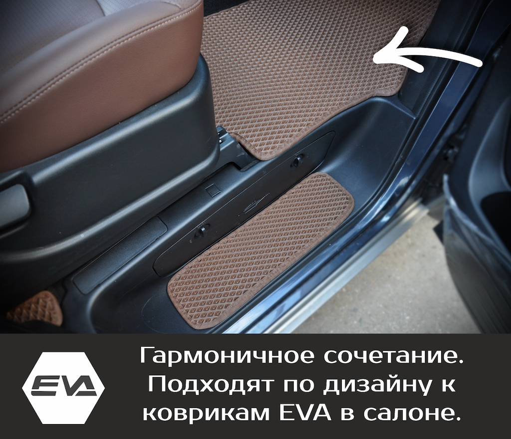 Накладки на пороги гармонично сочетаются с салонными ковриками EVA, дополняя друг друга.
