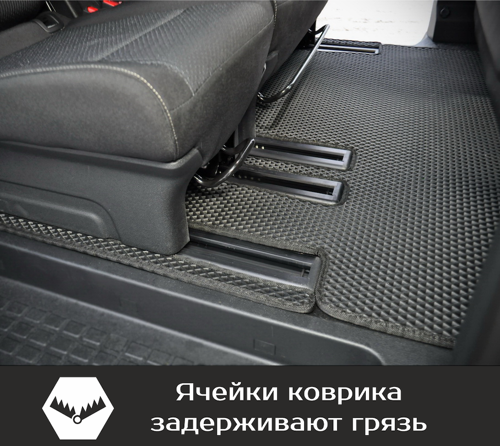 Нижняя часть ковра изготавливается из термопластичной резины с шипами 2-3 мм по всей поверхности, что предотвращает скольжение коврика по салону автомобиля.